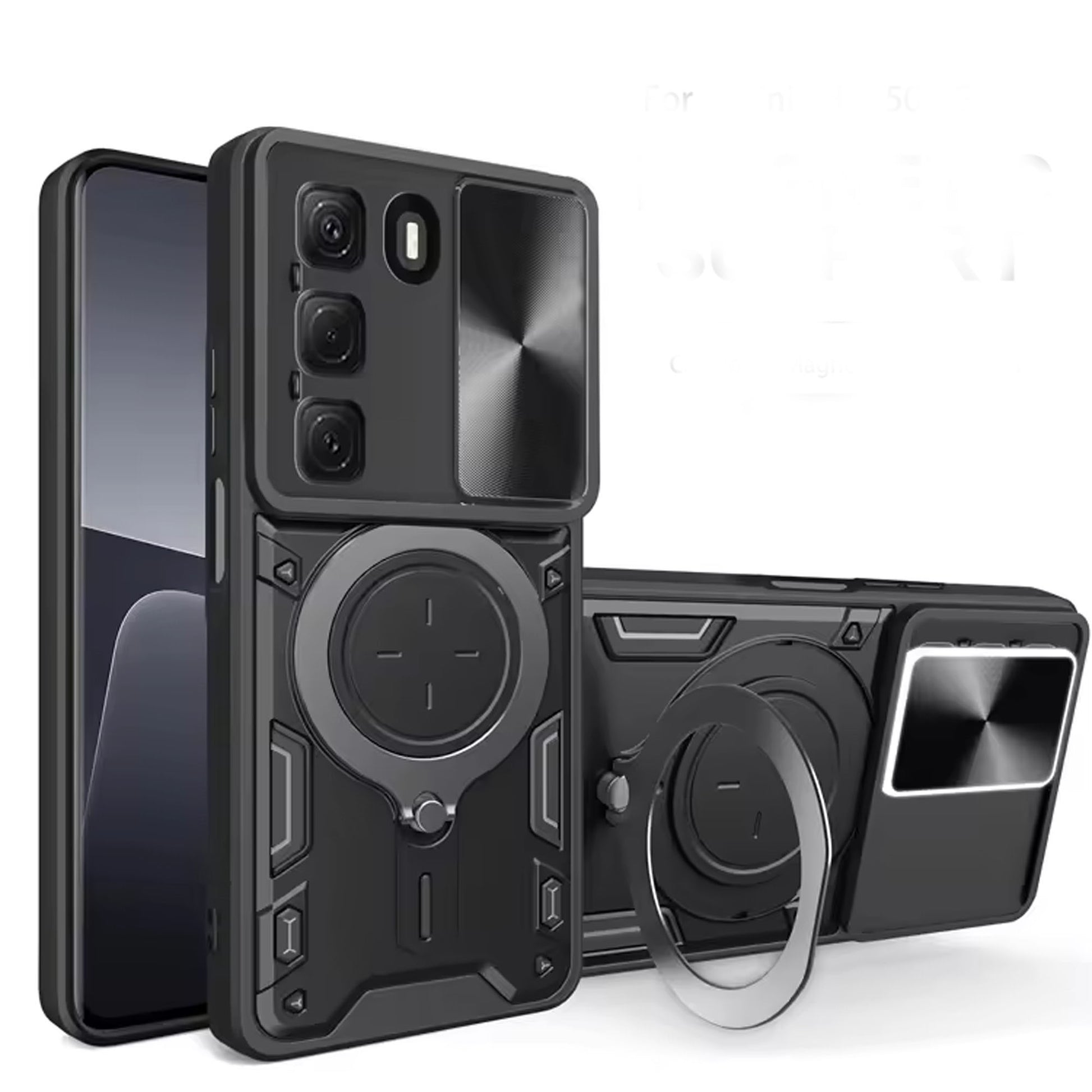 - The RMG Case is the epitome of protection fused with functionality. Crafted with precision, this case seamlessly envelopes your device in a robust shield without compromising on style or usability.Its design features a fusion of materials, combining a durable metal ring with a protective armor hybrid, ensuring maximum safeguarding against daily wear, accidental drops, and impacts. The amalgamation of sturdy materials provides a reliable shield for your device's camera, keeping it safe from scratches, bumps, and cracks.What sets this case apart is its innovative rotating holder at the back, offering unparalleled convenience. Whether you're watching videos, browsing, or taking photos, this rotating holder provides a comfortable grip and transforms into a handy stand for hands-free viewing in both portrait and landscape orientations.The precise cutouts guarantee easy access to ports, buttons, and the camera, allowing for seamless functionality without compromising on protection. Its slim profile ensures a snug fit, maintaining the sleek aesthetics of your mobile while adding an extra layer of defense.With the RMG Case, enjoy the perfect balance of style, durability, and functionality, ensuring your device remains safeguarded while complementing your lifestyle.
